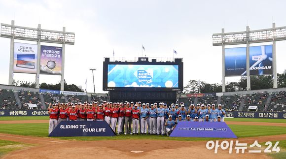 16일 오후 서울 잠실야구장에서 '2022 신한은행 SOL KBO 올스타전' 드림 올스타와 나눔 올스타의 경기가 열렸다. 올스타전 참석 선수들과 감독들이 기념촬영을 하고 있다. [사진=김성진 기자] |
