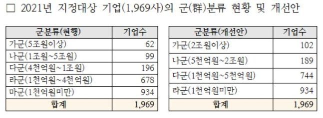문제점 보완을 위해 최상위군인 ‘가’군을 자산 규모 5조원 이상 기업에서 2조원 이상 기업으로 조정하고, 기존 5개 군 분류를 4개 군으로 조정했다.
