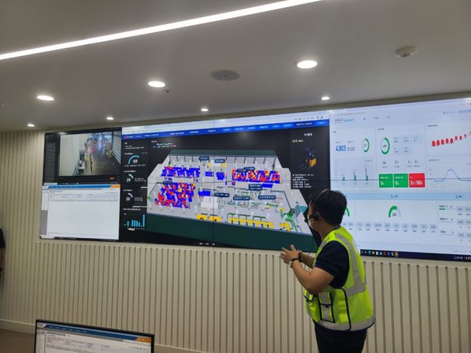 CJ대한통운 스마트 풀필먼스센터 종합 관제실에서는 디지털 트윈을 활용한 실시간으로 배송 처리 현황을 점검할 수 있다./사진=정한결 기자. |
