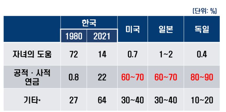 이어 "반면 우리나라의 비율은 22%에 불과하다. 우리나라 노인들은 자녀의 도움이 72%였다"라며 "그래서 중요한 것은 연금이다"라고 강조했다.
