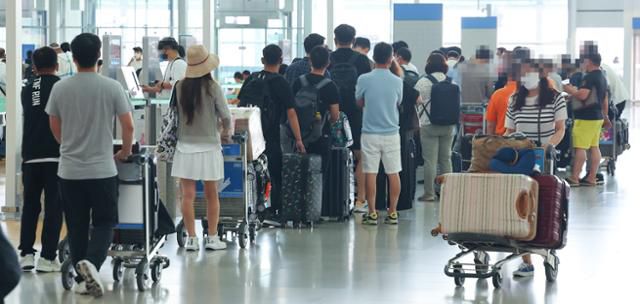 19일 인천국제공항 제2여객터미널 출국장에서 이용객들이 탑승수속을 밟기 위해 대기하고 있는 모습. 연합뉴스