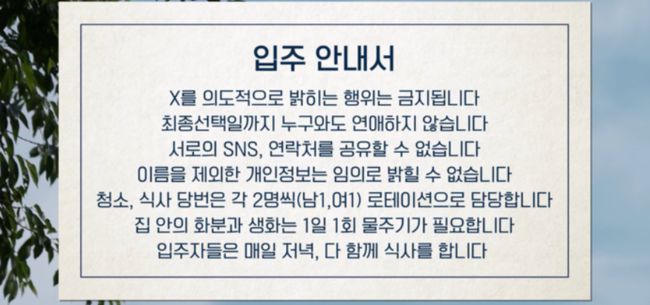 당시 공개된 입주 안내서에 따르면 "X를 의도적으로 밝히는 행위는 금지된다", "최종선택일까지 누구와도 연애하지 않는다", "서로의 SNS, 연락처를 공유할 수 없다", "이름을 제외한 개인정보는 임의로 밝힐 수 없다", "청소, 식사 당번은 각 2명씩(남1, 여1) 로테이션으로 담당한다", "집 안의 화분과 생화는 1일 1회 물주기가 필요하다", "입주자들은 매일 저녁 다 함께 식사를 한다" 등의 규칙이 적혀 있었다.