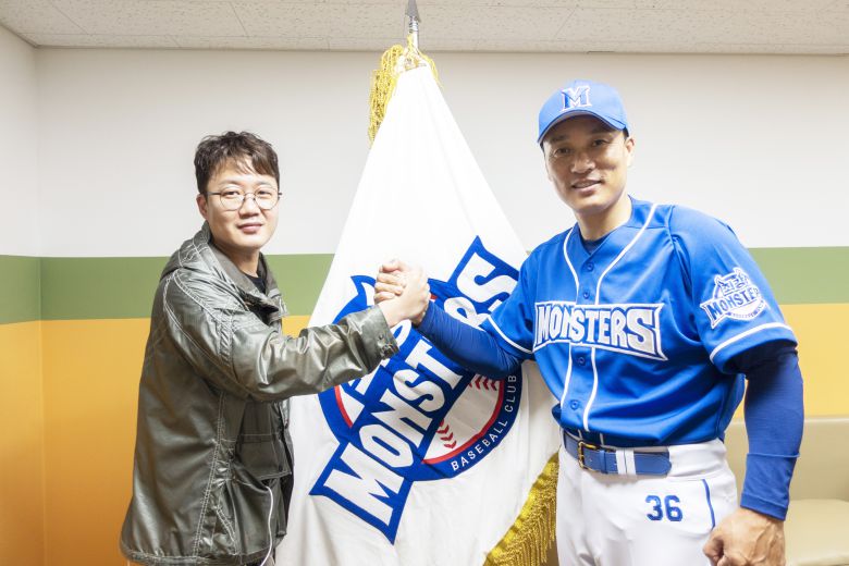 최강야구 장시원 PD와 이승엽 감독이 22일 수원 KT 위즈파크 원정감독실에서 기념촬영을 하고 있다. 수원 류재민 기자 |
