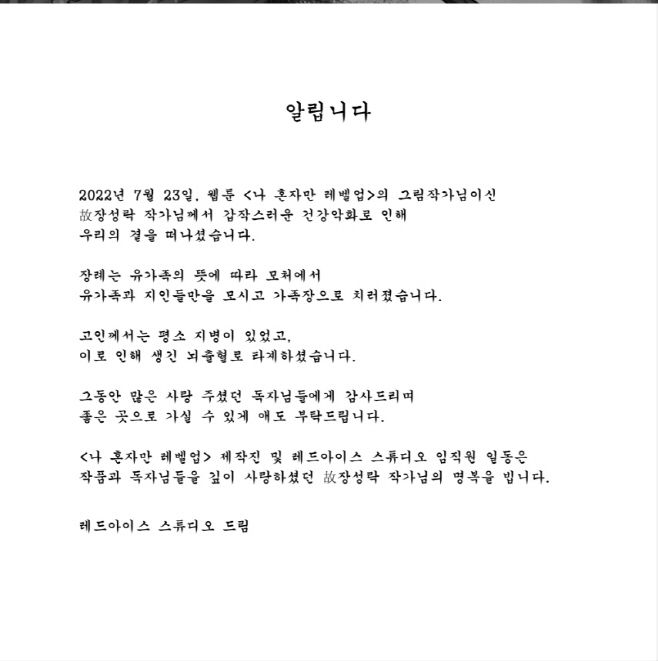 아시아투데이 지환혁 기자 = 웹툰 '나 혼자만 레벨업'의 그림작가인 장성락 작가가 지난 23일 지병으로 숨졌다.