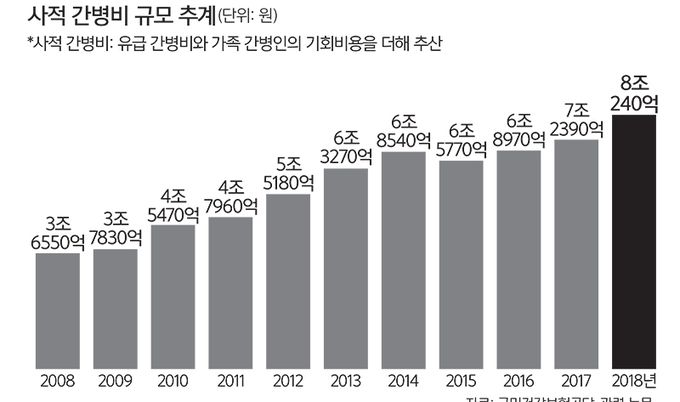 간병 수요는 점점 늘어나는 추세다. 25일 학술지 ‘보건경제와 정책연구’에 실린 ‘사적 간병비 규모 추계와 간호간병통합서비스 정책적 시사점’(2021년 4월) 논문을 보면, 유급 간병비와 가족 간병인의 기회비용 등을 더한 ‘사적 간병비’ 규모는 2008년 3조6550억원에서 10년 뒤인 2018년 8조240억원으로 증가했다. 사적 간병 수요는 연인원 기준 같은 기간 5774만명에서 8944만명으로 늘었다.