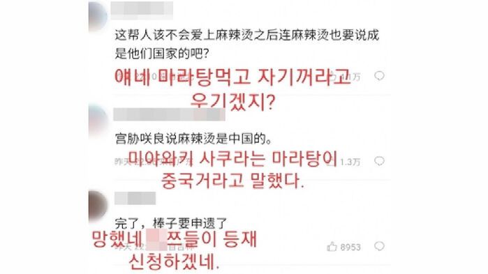 일부 누리꾼은 '한국이 곧 마라탕까지 자기네 음식이라고 우길 것이다', '김치에 이어 마라탕을 훔쳐 갈 것'이라는 억지 주장을 펼쳤습니다.