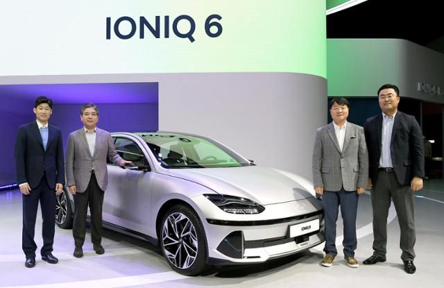 14일 2022 부산국제모터쇼에서 공개된 아이오닉6 옆에서 박지성(왼쪽부터) 현대차 월드컵 캠페인 국내 앰버서더, 장재훈 현대차 대표이사, 유원하 현대차 국내사업본부장, 김흥수 현대자동차 EV사업부장이 기념촬영을 하고 있다. 현대차 제공 |