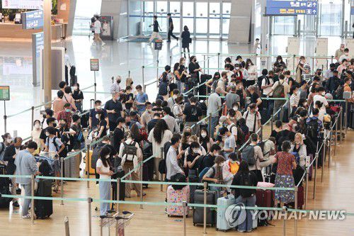 (영종도=연합뉴스) 서대연 기자 = 24일 오전 인천국제공항 제1여객터미널 출국장이 승객들로 붐비고 있다. 2022.7.24 dwise@yna.co.kr