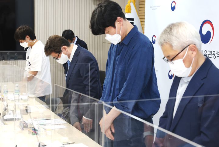 [서울=뉴시스] 박보균(왼쪽 두번째) 문화체육관광부 장관이 29일 서울 용산구 문체부 저작권보호과 서울사무소에서 고인이 된 장성락 웹툰 작가에 대한 묵념을 하고 있다. (사진=문화체육관광부 제공) 2022.07.29. newsis@photo.com *재판매 및 DB 금지 |