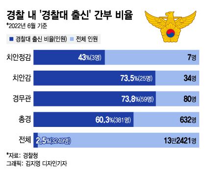 28일 경찰청 자료에 따르면 경찰대 출신은 경찰 고위 계급의 상당수를 차지한다. 일선 경찰서 서장급인 총경 계급의 경우 전체 632명 중 381명(60.3%)이 경찰대 출신이다. 경무관 계급은 80명 중 59명(73.8%), 치안감 계급은 34명 중 25명(73.5%)이다. 치안정감은 7명 중 3명이 경찰대 출신이다.