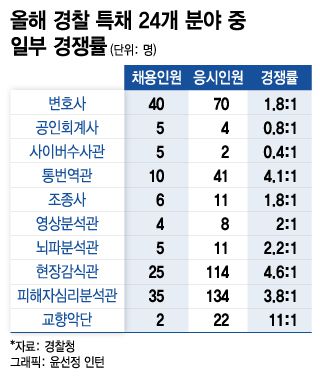 가장 대표적인 특채는 변호사 특채다. 경찰은 사법시험이 변호사시험으로 대체되자 2014년부터 기존 경정급으로 뽑던 법조인 출신 간부를 한 계급 낮춰 경감급으로 뽑고 있다. 2018년 20명 채용에 227여명이 지원해 역대 최고 경쟁률(11.35 대 1)을 기록했다. 올해 하반기 채용에도 40명 채용에 70명이 원서를 냈다.