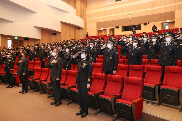 (서울=뉴스1) = 2일 오전 충남 아산 경찰대학교에서 42기 경찰대학 학생 50명과 71기 경위 공개경쟁 채용시험 합격자(구 경찰간부후보생) 50명의 합동입학식이 진행되고 있다. (경찰청 제공) 2022.3.2/뉴스1 |