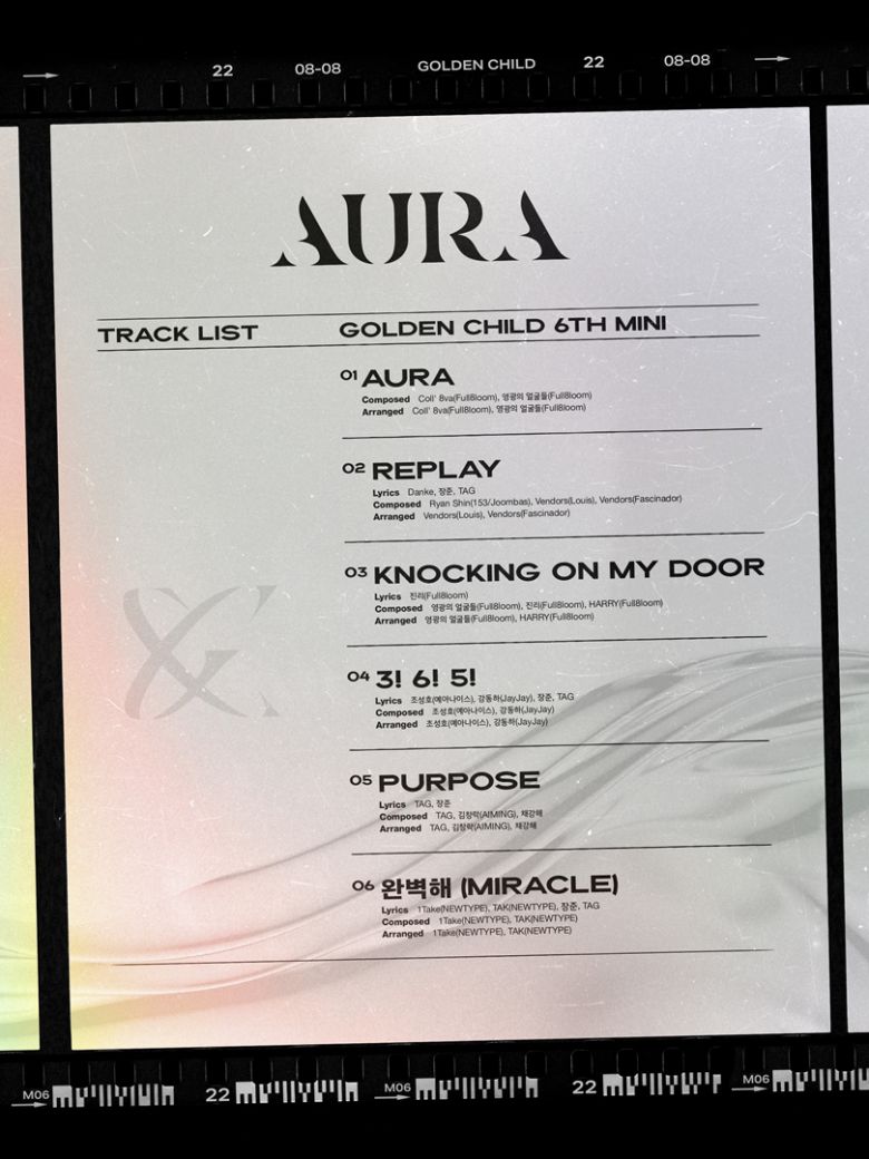 카메라 필름을 연상시키는 듯한 트랙리스트에 따르면 '아우라'에는 이번 앨범과 동명의 곡 '아우라'를 시작으로 타이틀곡 '리플레이', 수록곡 '노킹 온 마이 도어', '3! 6! 5!', '퍼포즈', '완벽해'까지 다채로운 총 6곡이 실린다.