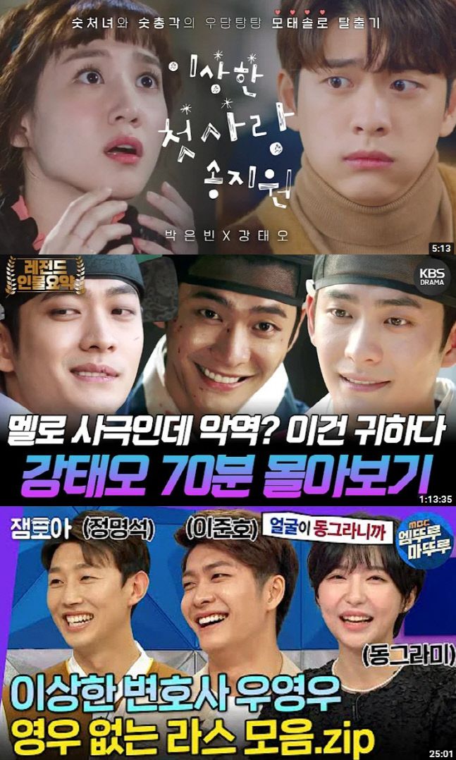 KBS도 유튜브 채널 ‘KBS Drama’에서 박은빈과 전배수의 ‘오늘의 탐정’, 강태오의 ‘조선로코-녹두전’, 강태오와 하윤경의 ‘드라마 스페셜 2021 - 딱밤 한 대가 이별에 미치는 영향’을 십분 활용하고 있다. ‘귀신 잡는 탐정 토끼가 된 우영우?! 귀신 돕는 빌런이 되어버린 영우 아빠 박은빈한테 그로지마로라’, ‘우영우 썸남 이준호 X 봄날의 햇살 최변 하윤경 화려한 과거(feat. 우영우 눈감아)’, ‘이준호가 악역이면 심장이 빨리 뛰지 않는 건가요...? 멜로 사극 하는 애틋 섭남 강태오 귀해서 안 보고 가면 섭섭한데요’ 등 영상이 그 예다.