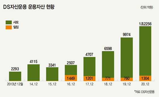 DS금융그룹의 핵심 계열사는 DS자산운용이다. DS자산운용은 국내 사모펀드 시장에서 황성환 대표가 이끄는 타임폴리오와 시장을 양분하고 있다. 장 회장과 인연이 오래된 위윤덕 대표가 DS자산운용을 이끄는 중이다. DS자산운용은 지난해 운용자산 1조원을 넘어선 데 이어 4월 말 1조5000억원을 돌파했다. 손익 관리도 탁월해 자기자본 규모는 1000억원을 돌파해 대형사 반열에 올라섰다.