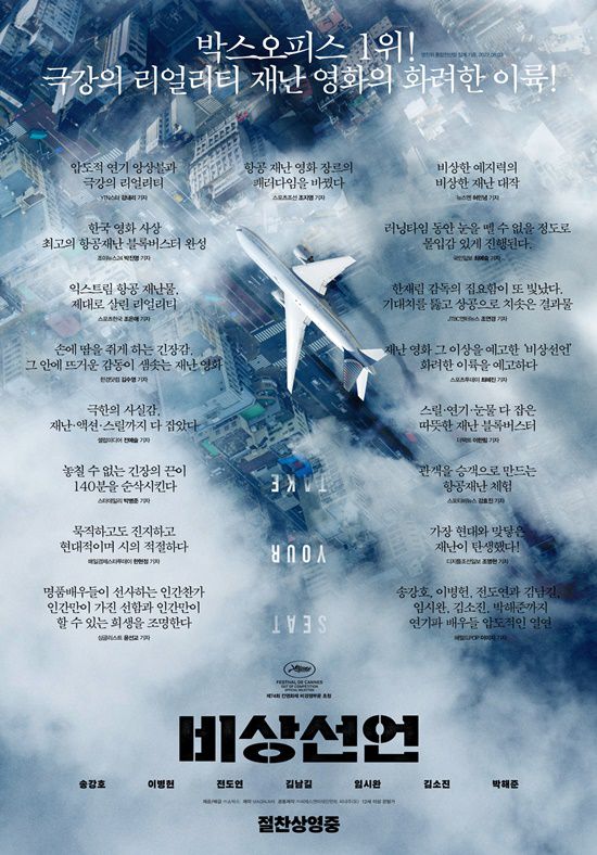 또 "땀을 쥐게 하는 긴장감, 그 안에 뜨거운 감동이 샘솟는 재난 영화", "극한의 사실감, 재난, 액션, 스릴까지 다 잡았다" 등 '비상선언'의 압도적 긴장감과 몰입감에 쏟아지는 호평들도 찾아볼 수 있다.