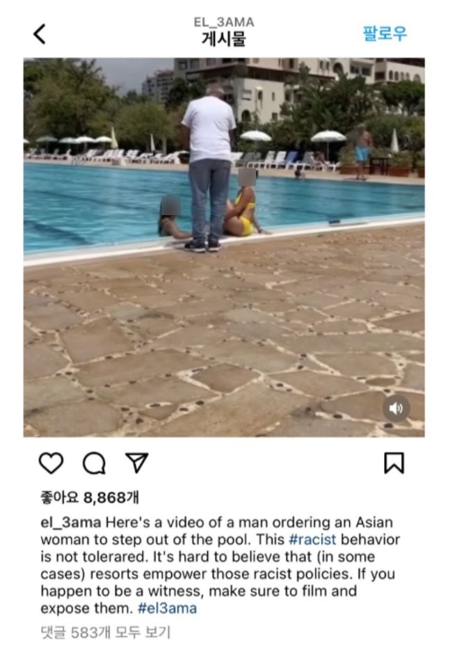 이 투숙객은 게시물에서 “이같은 인종차별은 용인할 수 없다. 리조트들에 (아시아 가정부, 보모 등의 수영을 금지하는) 인종차별적 규정이 있다는 것도 믿을 수 없다”고 성토하며 “비슷한 현장을 목격한다면 영상으로 찍어서 제보해달라”고도 적었다.