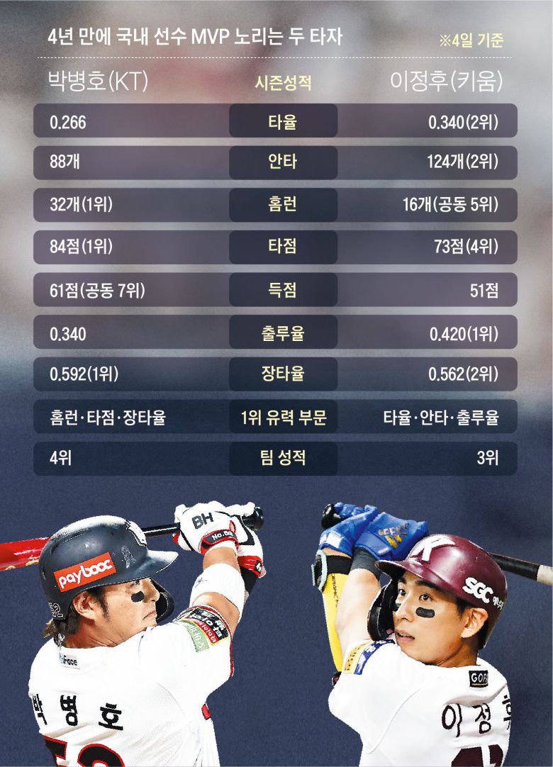 올해에는 리그 최고 타자를 노리는 두 선수가 4년 만의 국내 선수 MVP에 도전한다. 더 정확해진 타격에 장타력까지 더한 이정후(24·키움)와 홈런왕 자리를 예약한 박병호(36·KT)가 그 주인공이다.