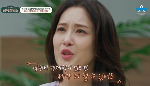 장가현은 "남편이 경제적으로 안 되면 내가 벌 수 있는데 남편에게 무시 당한다는 느낌을 못 참았다"며 결국 감정을 터뜨리며 눈물을 보였다. 장가현은 "영화 계약금으로 미술학원비 냈다, 딸이 원하는 걸 하기 위해 선택했던 일"이라며 살아가는데 중요한 생계였다고 했다.