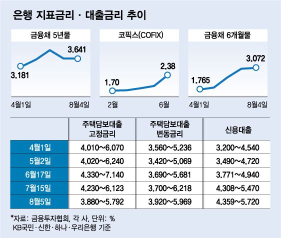 반면 주담대 고정금리의 지표가 되는 금융채 5년물(무보증·AAA) 금리는 6월 중순 이후 떨어지고 있다. 미국 연방준비제도(Fed)의 '자이언트 스텝(한 번에 기준금리 0.75%포인트 인상)' 직후인 6월17일 4.147%까지 올랐다가 지난달 15일 3.642%로 낮아졌다. 지난 4일엔 3.641%에 머무르고 있다.