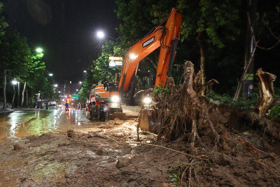 폭우가 내린 9일 오전 서울 서초구의 한 도로에 산사태가 발생해 일부 차선 통제와 복구 작업이 이뤄지고 있다. 연합뉴스 |