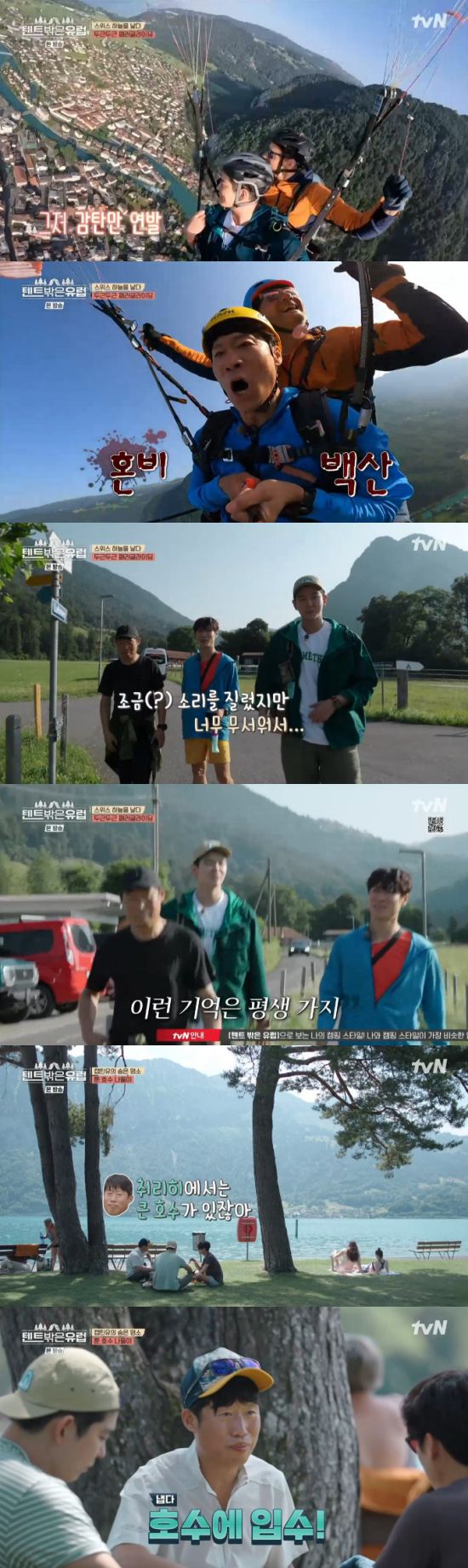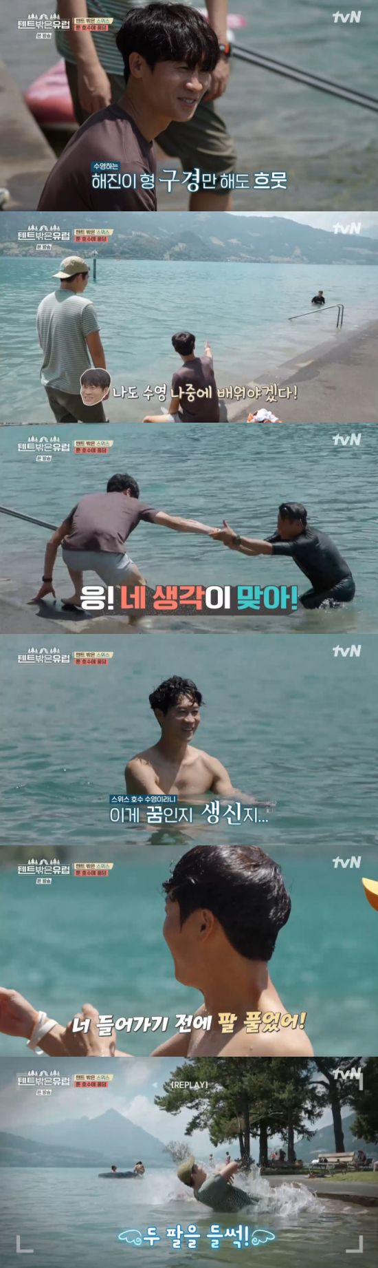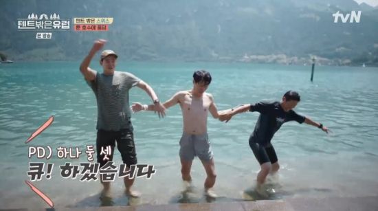 10일 방송된 tvN '텐트 밖은 유럽'에서는 유해진, 진선규, 윤균상이 툰 호수에서 수영하는 장면이 전파를 탔다.