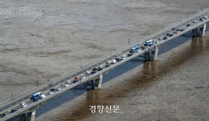 다리 밑까지 흙탕물 수도권 집중호우로 흙탕물로 변한 한강 수위가 상승한 지난 10일 서울 여의도 63스카이아트미술관에서 바라본 원효대교 위 출근길 차량이 서행하고 있다. 성동훈 기자 |