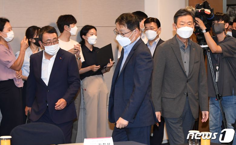 유영상 SK텔레콤 대표(왼쪽부터), 구현모 KT 대표, 황현식 LG유플러스 대표가 11일 서울 중구 대한상공회의소에서 열린 과학기술정보통신부 장관과 통신 3사 CEO 간 간담회장에 들어서고 있다. (공동취재) 2022.7.11/뉴스1 ⓒ News1 임세영 기자 |
