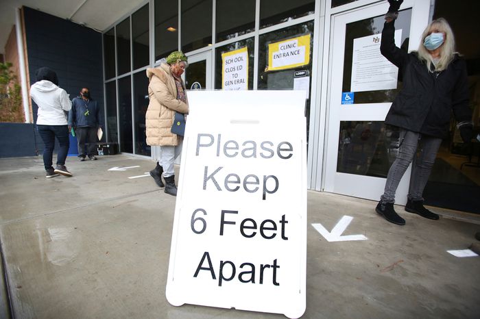 지난해 1월27일(현지시간) 미국 캘리포니아주 네바다유니온고등학교에서 백신을 접종받으려고 기다리는 이들에게 ‘6피트(1.82m) 거리두기’를 하라고 알리는 표지판이 설치돼 있다. 미 질병통제예방센터(CDC)는 11일 사회적 거리두기와 격리를 없애는 등 코로나19 관련 새로운 지침을 발표했다. AP연합뉴스
