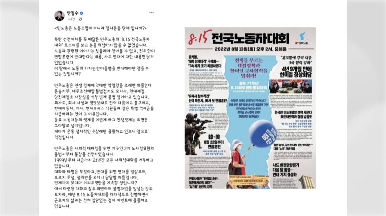 국민의힘 안철수 의원은 내일(13일) 진행될 민주노총의 '8·15 전국 노동자 대회' 포스터가 북한 선전 매체를 꼭 빼닮았다면서, 노동조합이 아니라 정치운동 단체냐고 비판했습니다.