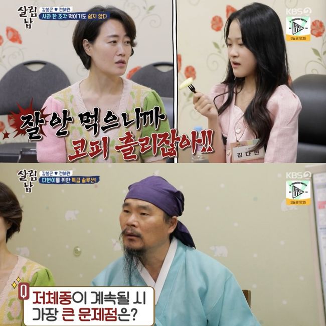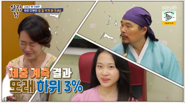 결국 김봉곤-전혜란 부부는 행사를 마친 뒤 김다현을 이끌고 한의원을 찾았다. 진단 결과를 듣기 위해 한의사를 만난 세 사람. 전혜란은 “다현이 먹이는 게 힘들다 코피도 안 흘리던 애가 코피도 흘렸다”고 말했다. 이에 한의사는 “다현이 몸무게가 하위 3%다. 뒤에서 세 번째”라고 강조했다. 그러면서 “다행히 소화기는 괜찮지만 간과 신장이 약해서 건강 개선이 필요하다”라고 조언했다.