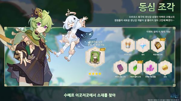 '동심조각'의 튜토리얼 임무 '조각은 어려워'를 체험할 때 새 캐릭터 콜레이를 획득할 수 있다. 이후 촬영, 도전, 질주 등과 더불어 새 원소 반응을 활용한 전투를 거쳐 영감을 모아 '지혜의 왕관'을 비롯해 다양한 보상을 획득하는 방식이다. 이 과정에서 부품을 모아 정령 목각을 만들어 이벤트 전시대에 배치하는 것도 가능하다.