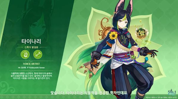 5성 캐릭터 타이나리는 소년 학자이자 숲의 순찰관으로, 다단 피해를 입히는 연쇄 공격에 특화됐다. 조준 사격에서 2단 차지 공격이 가능하며 '화엽의 화살'을 발사해 명중하면 적을 추적하는 '꽃을 품은 화살'이 생성된다.