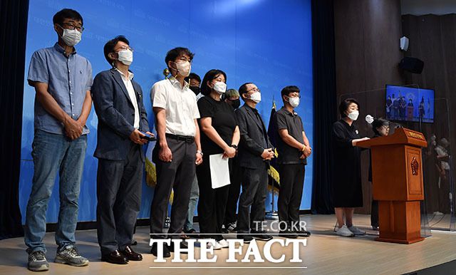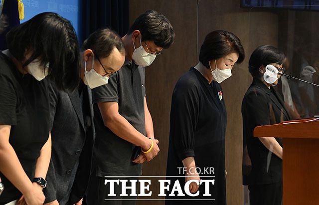 [더팩트ㅣ국회=남윤호 기자] 심상정 정의당 의원(오른쪽 두 번째)이 16일 오후 서울 여의도 국회 소통관에서 열린 반지하 주거 대책 및 주거기본법 개정 촉구 기자회견에서 묵념하며 폭우로 숨진 반지하 일가족을 추모하고 있다.