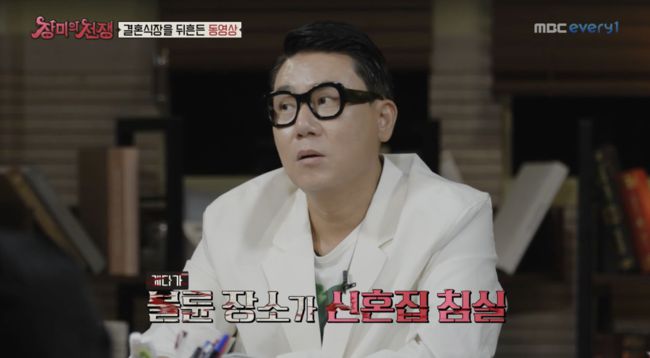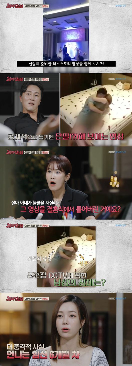 그런데 신랑이 준비한 영상이 문제가 됐다. 이를 본 하객들은 술렁거렸고, 신랑은 신부를 밀치고, 신부는 신랑에게 부케를 집어 던졌다. 패널들은 실수로 공개된 영상 아니냐며 놀란 토끼 눈이 됐다.