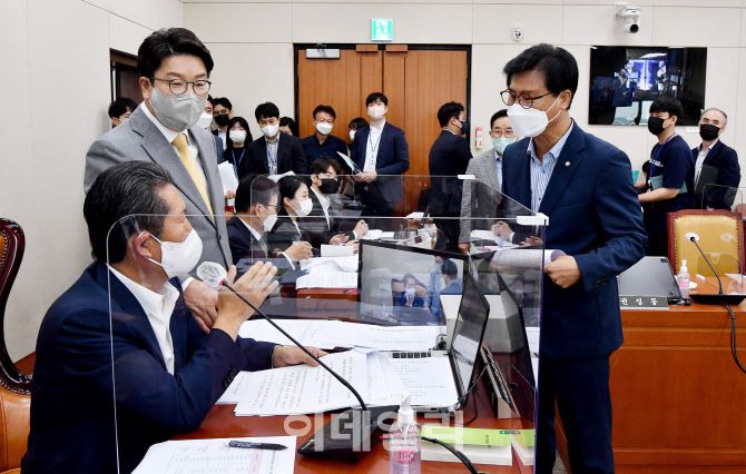 [이데일리 방인권 기자] 18일 서울 여의도 국회에서 열린 과학기술정보방송통신위원회 전체회의에서 권성동(왼쪽) 국민의힘 원내대표와 김영식 국민의힘 의원 등이 회의장을 나서며 정청래 위원장에게 항의하고 있다.