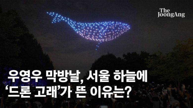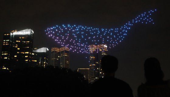 18일 오후 9시 서울 성동구 서울숲 가족마당. 어두워진 하늘 위로 거대한 고래 한 마리가 나타났다. 300대의 드론이 빛으로 만든 고래다. 이 고래는 마치 드라마 ‘이상한 변호사 우영우’ 속 한 장면처럼 헤엄치듯 하늘 위를 날더니 서서히 사라졌다.