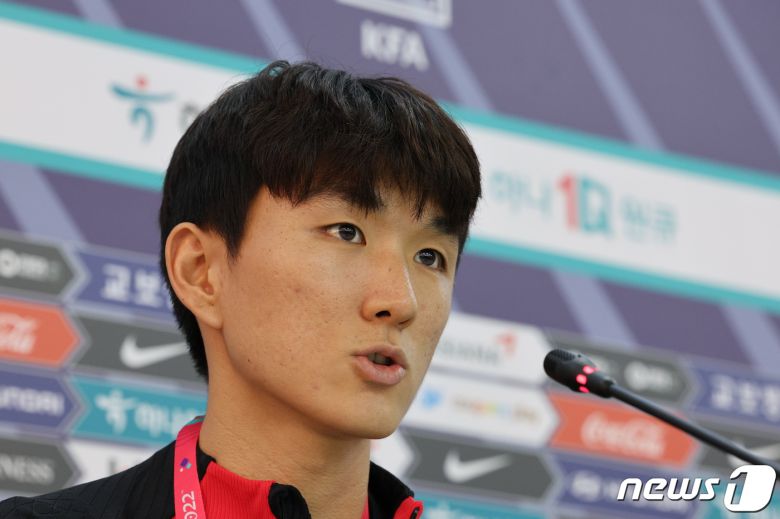 대한민국 축구대표팀 황인범이 15일 오후(현지시간) 카타르 도하 알 에글라 트레이닝센터에서 가진 훈련에 앞서 취재진과 인터뷰를 하고 있다. 2022.11.15/뉴스1 ⓒ News1 이광호 기자 |