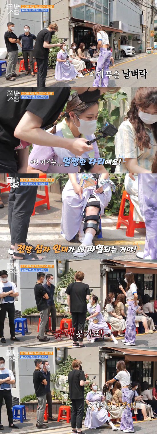 박나래의 다리를 본 한혜진은 "아니, 너 무슨 일이야. 왜 깁스를 하고 있어. 너 축구선수냐. 전방십자인대가 왜 파열되는거냐"라며 놀랐고, 박나래는 옆에서 줄을 기다리고 있던 손님을 향해 "제가 알아봤더니 여자 연예인 최초로 전방십자인대가 파열됐더라"며 너털웃음을 지었다.