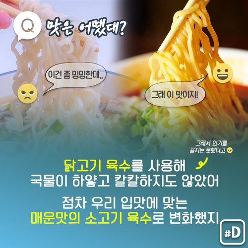 맛은 지금과 차이가 있었는데요. 닭고기 육수를 사용해 국물이 하얗고 지금처럼 칼칼한 맛도 아니었죠. 매운맛을 즐기는 한국인 입맛에 맞지 않아 인기를 끌지는 못했다고 해요.