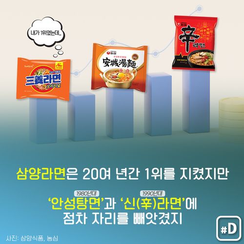 라면 시장에서 삼양라면은 20여 년간 1위를 지켰지만 1983년 농심에서 출시된 '안성탕면'이 자리를 빼앗았고, 1991년부터는 농심 '신라면'이 1위를 이어오고 있습니다.