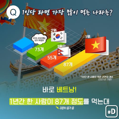베트남의 연간 1인당 라면 소비량은 2019년 55개, 2020년 72개, 작년 87개로 꾸준히 늘고 있는데요. 작년 라면 시장 규모는 86억 개로 중국(440억 개), 인도네시아(133억 개)에 이어 3위였죠.