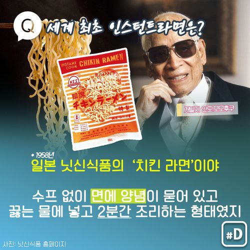 일본 닛신식품 창업자 안도 모모후쿠가 생면을 튀겨 건조하는 방법으로 인스턴트라면을 개발해 '치킨 라면'을 최초로 판매했죠.