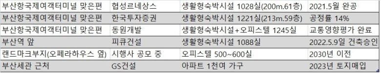 주거시설 신축은 여기에 그치지 않는다. 부산세관 근처 복합도심지구에는 우선협상대상자로 선정된 지에스(GS)건설은 2만7022㎡(8188평) 터에 1천여채 규모의 아파트 신축을 추진하고 있다. 부산항국제여객터미널 맞은편 상업·업무지구(4만5969㎡·1만3930평)에도 협성르네상스·한국투자증권·동원개발 3곳이 생활형 숙박시설 2914채와 오피스텔 580채 등 모두 3494채를 완공했거나 추진 중이다.