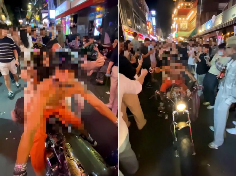 한 달 전 서울 강남에서 수영복 차림으로 오토바이 질주를 해 논란을 일으킨 남녀가 이번에는 이태원에 나타났다.
