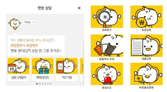 KB국민카드는 올해 AI기반으로 한 개인화 서비스와 최신 자연어처리 기술을 적용해 상담 정확도를 크게 높힌 '큐디(Qd) 3.0'서비스를 시작했다. KB국민카드 모바일홈 앱에서 발생하는 카드 관련 각종 업무 문의에 AI 알고리즘을 기반으로 답변 및 업무 처리까지 원스톱으로 가능하다.