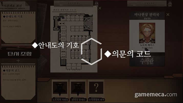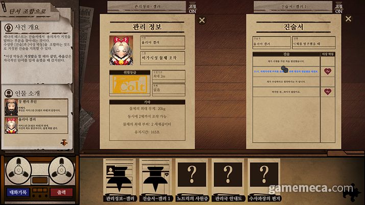 사건자료는 용의자들의 초능력을 기록해 놓은 문서부터, 동료들이 초능력을 이용해 조사한 기록까지 다양한 종류가 있으며, 각각 문서는 5개 이상의 단서를 포함하고 있다. 문서에 특정 부분들을 조합하여 새로운 사실을 조금씩 찾아가면 범인의 정체에 도달할 수 있다.