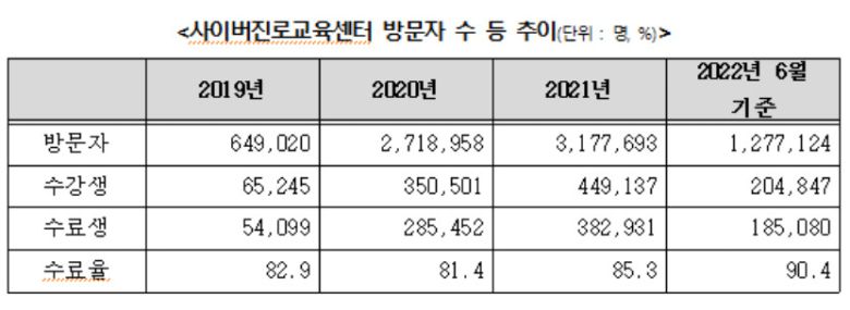 사이버진로교육센터는 작년 한 해 300만 명이 넘게 방문, 44만명 이상이 온라인 교육을 수강했다. 특히, 코로나가 본격화된 2020년부터 방문자 수와 수강생이 급증하는 등 언택트 시대에 체계적인 진로준비 및 진로개발 역량 강화를 위한 맞춤형 온라인 진로교육 플랫폼으로 떠오르고 있다. 사이버진로교육센터의 모든 강의는 회원가입 후 수강신청을 하면 누구나 무료로 이용할 수 있으며 하반기에 5개 과정이 신규로 추가됐다.