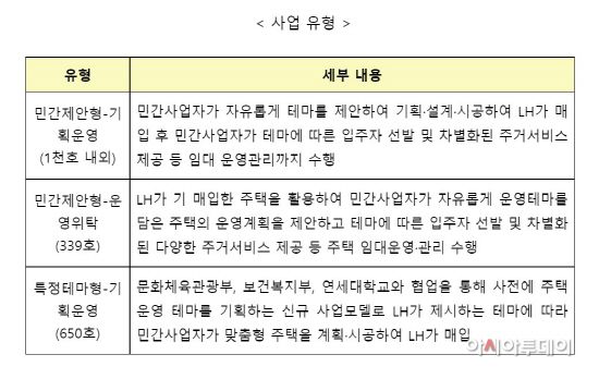 이번 공모 사업은 테마형 임대주택 2000가구 규모를 대상으로 한다. 사업 유형은 △민간제안형-기획운영 △민간제안형-운영위탁 △특정테마형-기획운영 총 3가지 방식이다.