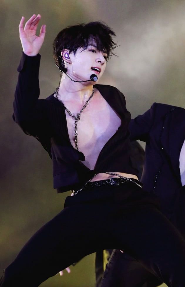 정국은 시원하게 상의가 오픈된 블랙 크롭탑과 바디 체인 사이로 땀에 젖은 탄탄한 가슴 근육, 선명한 복근을 보여주며 핵폭탄급 섹시함을 선사했고 상큼 큐티 러블리한 표정을 지으며 여심을 녹이는 냉온 매력 등으로 팬심에 불을 지폈다.